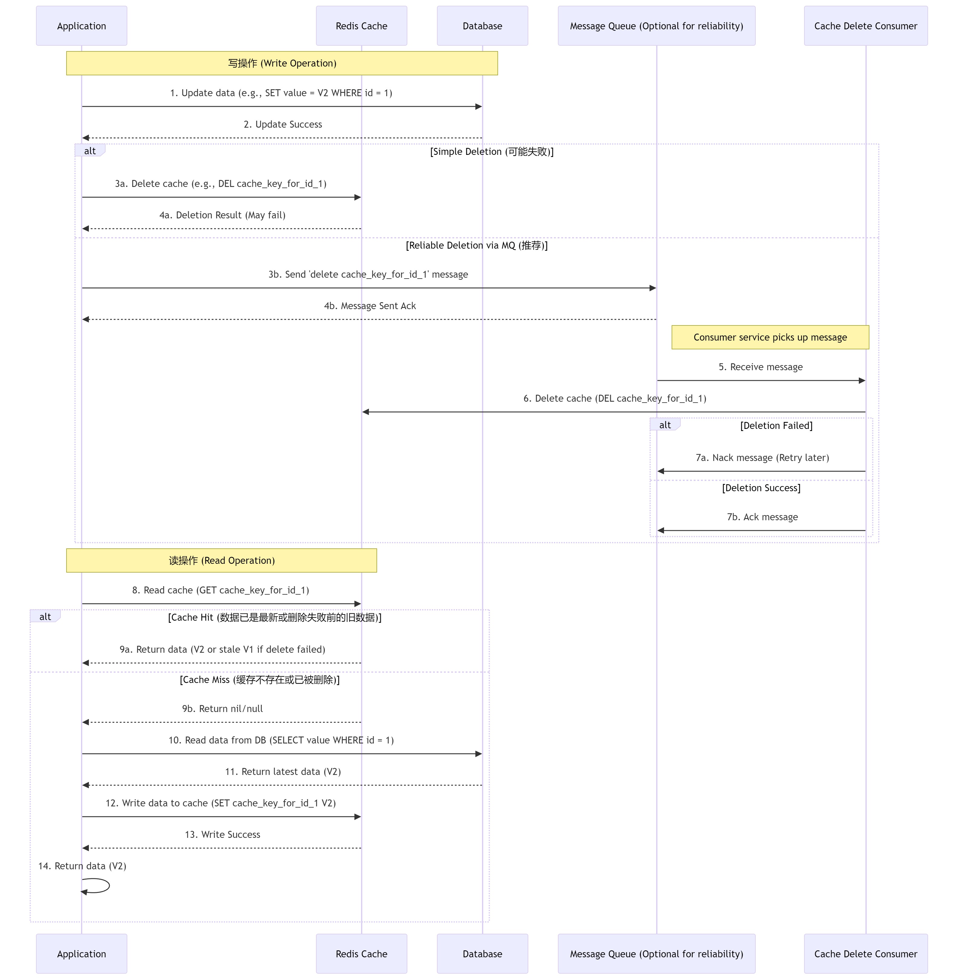 - 更新数据库成功,但删除缓存失败(网络问题、Redis 故障)。这会导致数据库是新数据,缓存是旧数据,且后续读请求会一直命中旧缓存。