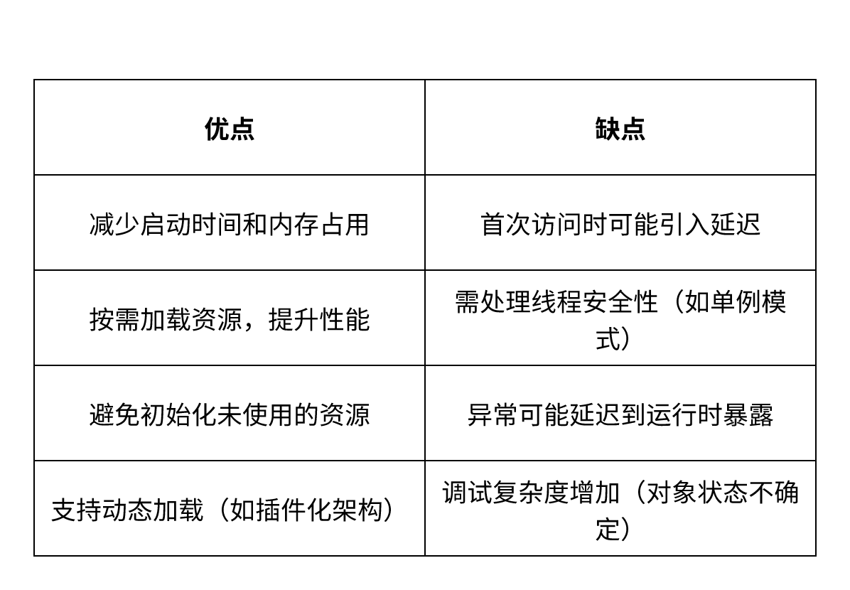- 按需加载:适用于初始化成本高或使用频率低的资源。